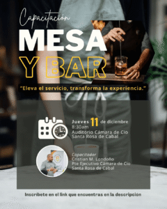La Cámara de Comercio de Santa Rosa de Cabal invita a todos los interesados a participar en la capacitación Mesa y Bar, que se realizará este jueves 11 de diciembre en nuestro auditorio y será dirigida por el presidente ejecutivo Cristian Londoño.