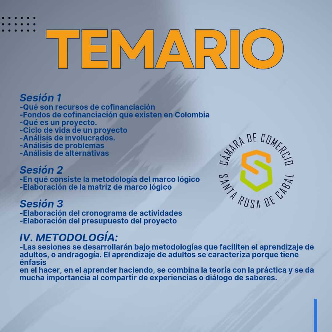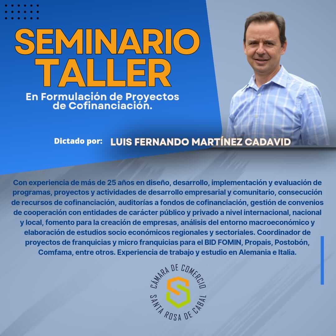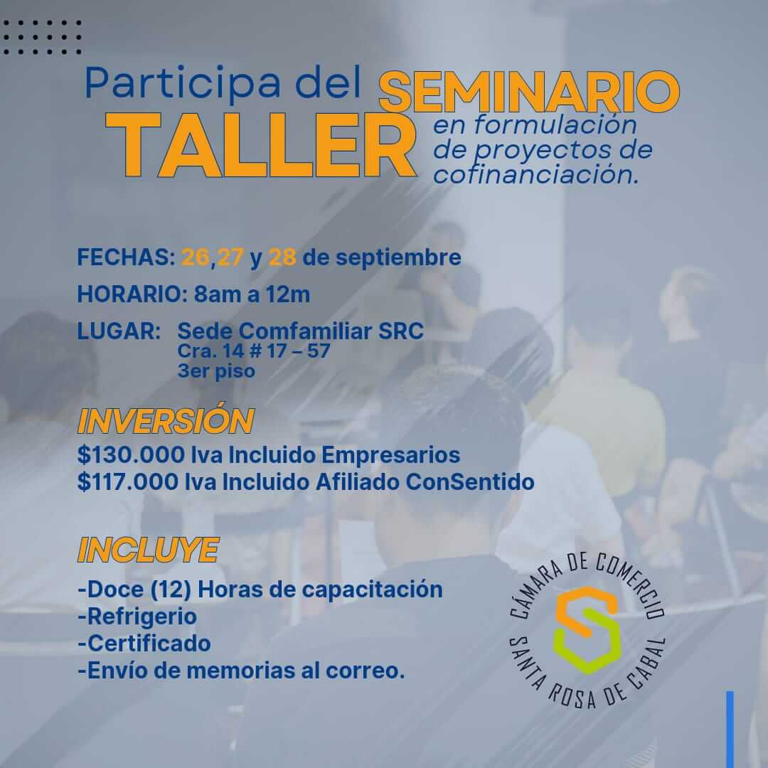 La Camara de Comercio de Santa Rosa lo invita a inscribirse en seminario taller de formulación de proyectos 26,27 y 28 sept 8:00AM a 12M Comfamiliar SRC piso 3 link: https://forms.gle/2DM88rCMpnjiXGyw7