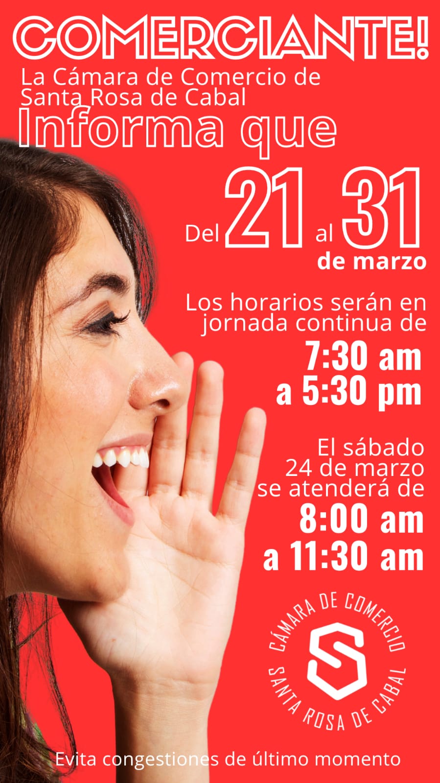 La Cámara de Comercio de Santa Rosa de Cabal identificada con el Nit 891.400.792-4 Para ofrecer las mejores experiencias, utilizamos tecnologías como las cookies para almacenar y/o acceder a la información del dispositivo además contamos con una Cláusula de autorización para el tratamiento de datos personales para mas información dar clic en el enlace de "Política general de tratamiento de datos personales" . El consentimiento y la autorización de estas tecnologías nos permitirá procesar datos como el comportamiento de navegación o las identificaciones únicas en este sitio. No consentir o retirar el consentimiento, puede afectar negativamente a ciertas características y funciones. Para mas Información  tenemos habilitado los siguientes canales de comunicación: Email: habeasdata@camarasantarosa.org Teléfonos: (606) 3638746/ 3218164566 Formulario  Web: https://www.camarasantarosa.org/contactenos/