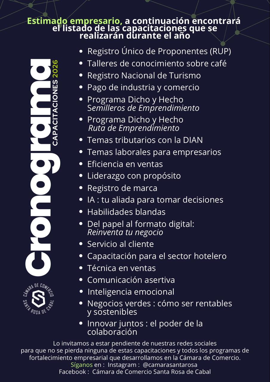 Bienvenido/a a la página de renovación de la Cámara de Comercio de Santa Rosa de Cabal en esta jornada de renovación del año 2026. Nos complace ofrecerte la oportunidad de renovar tu membresía y seguir disfrutando de los numerosos beneficios que ofrecemos a nuestros matriculados. ¡No pierdas la oportunidad de mantener tu matrícula activa y aprovechar todas las ventajas que te brinda ser parte de nuestra red empresarial!