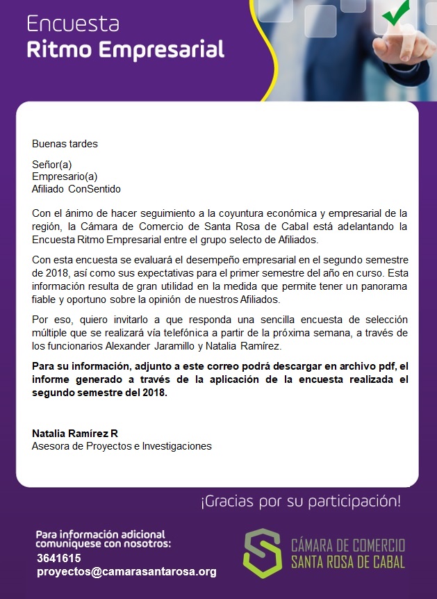 Señor(a) empresario Afiliado ConSentido, sea parte de la coyuntura económica del municipio participando activamente de la Encuesta Ritmo Empresarial 2019